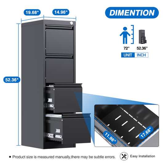 4 Drawer File Cabinet, Metal Vertical File Storage Cabinet With Lock, Office Home Steel File Cabinet For A4 Letter Legal Size, 14.96inch W X 17.72inch D X 52.36inch H, Assembly Required Black