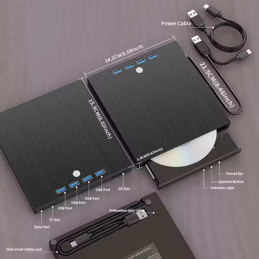 External Optical Drive, 8-in-1 USB 3.0 Ultra Slim Portable, USB3.0+Type-C External Mobile DVD Burner HD Player, Portable CD/VCD/DVD Player, Plug-in Expandable Burner, Burn, Read and Play on Laptops and PCs. Supports Windows/Linux, Suitable for MAC