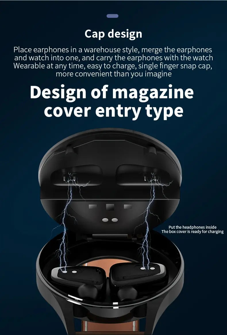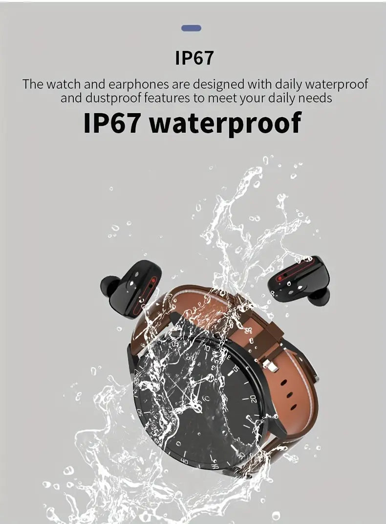 Experience the perfect blend of style and functionality with this Smart Watch featuring built-in wireless earplugs. Designed for men or women who value convenience, it combines a fitness tracker, sleep monitor, and sports watch with a speaker that lets you answer calls hands-free. Compatible with both Android and iPhone, it offers long standby time to keep up with your active lifestyle. Whether you're tracking workouts or staying connected on the go, this 2-in-1 headset watch supports your daily needs seamlessly.
