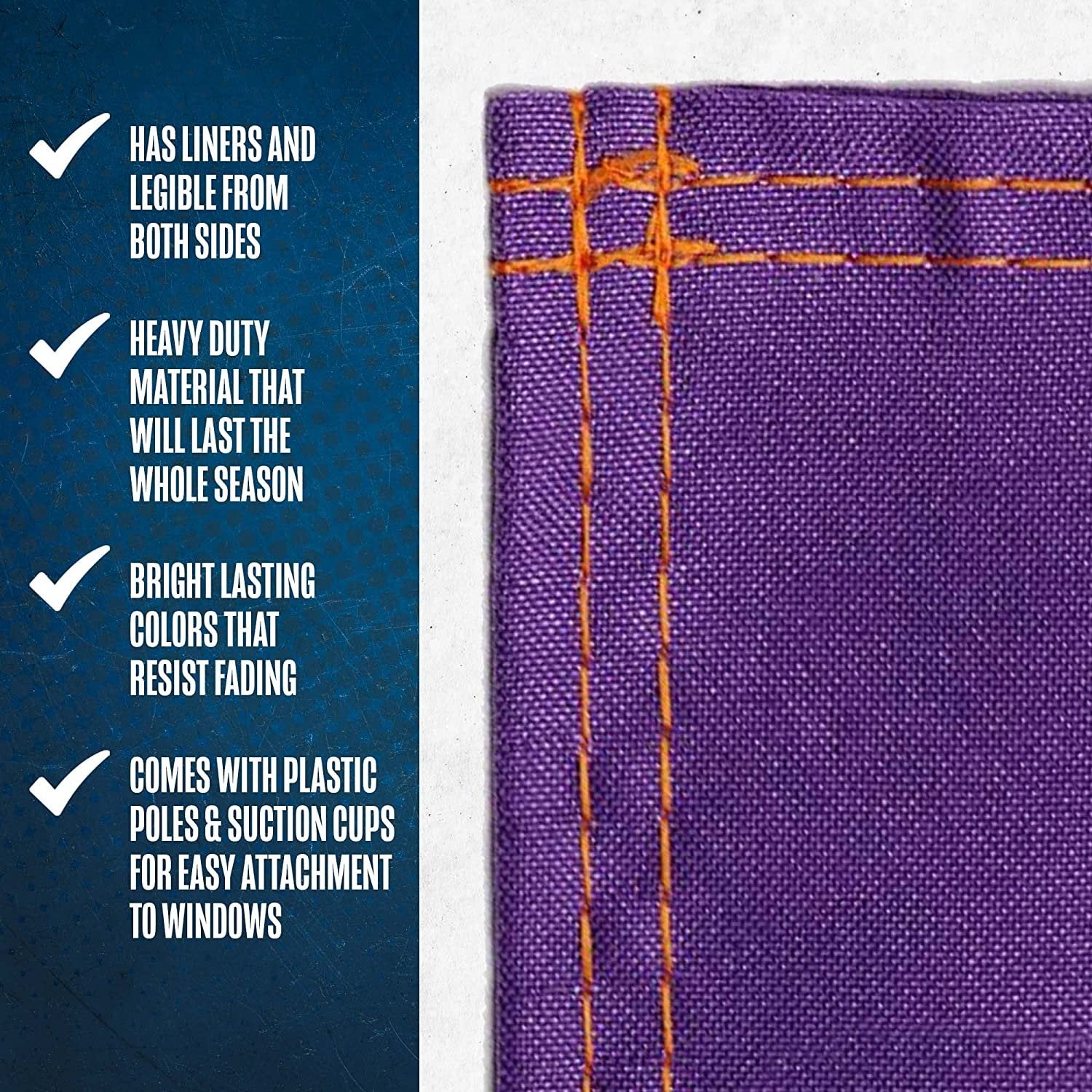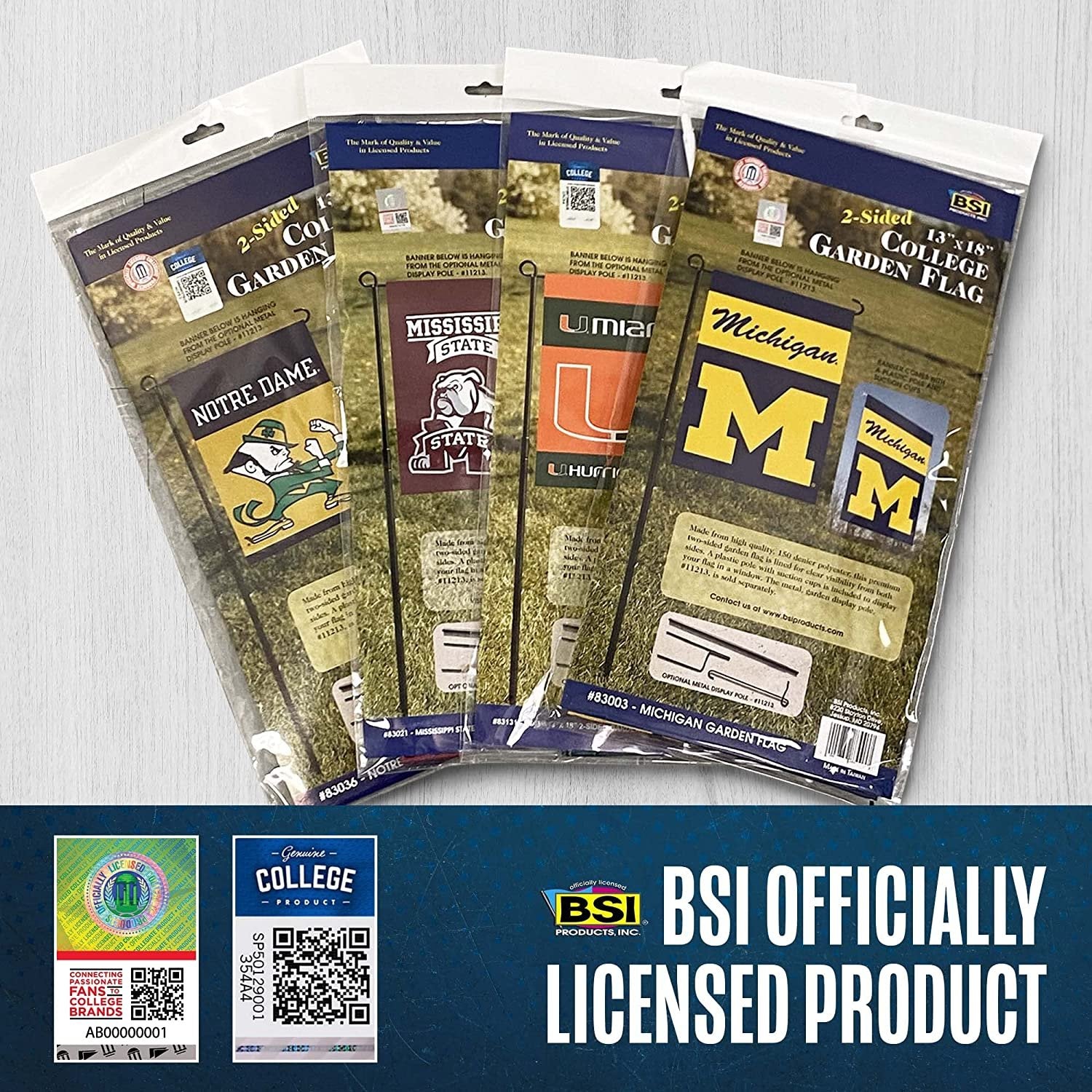 Support your favorite team by hanging up this two-sided Collegiate premium 2-sided garden flag. This 13-inch x 18-inch flag is made of durable, heavy-duty 150-denier polyester and has a 1" pole sleeve so it is easy to hang. The officially licensed banner is brightly decorated in the team colors and proudly displays the official team graphics on both sides. The flag also includes a free plastic pole w/ suction cups for hanging in a window. The #11213 metal garden pole is sold separately.