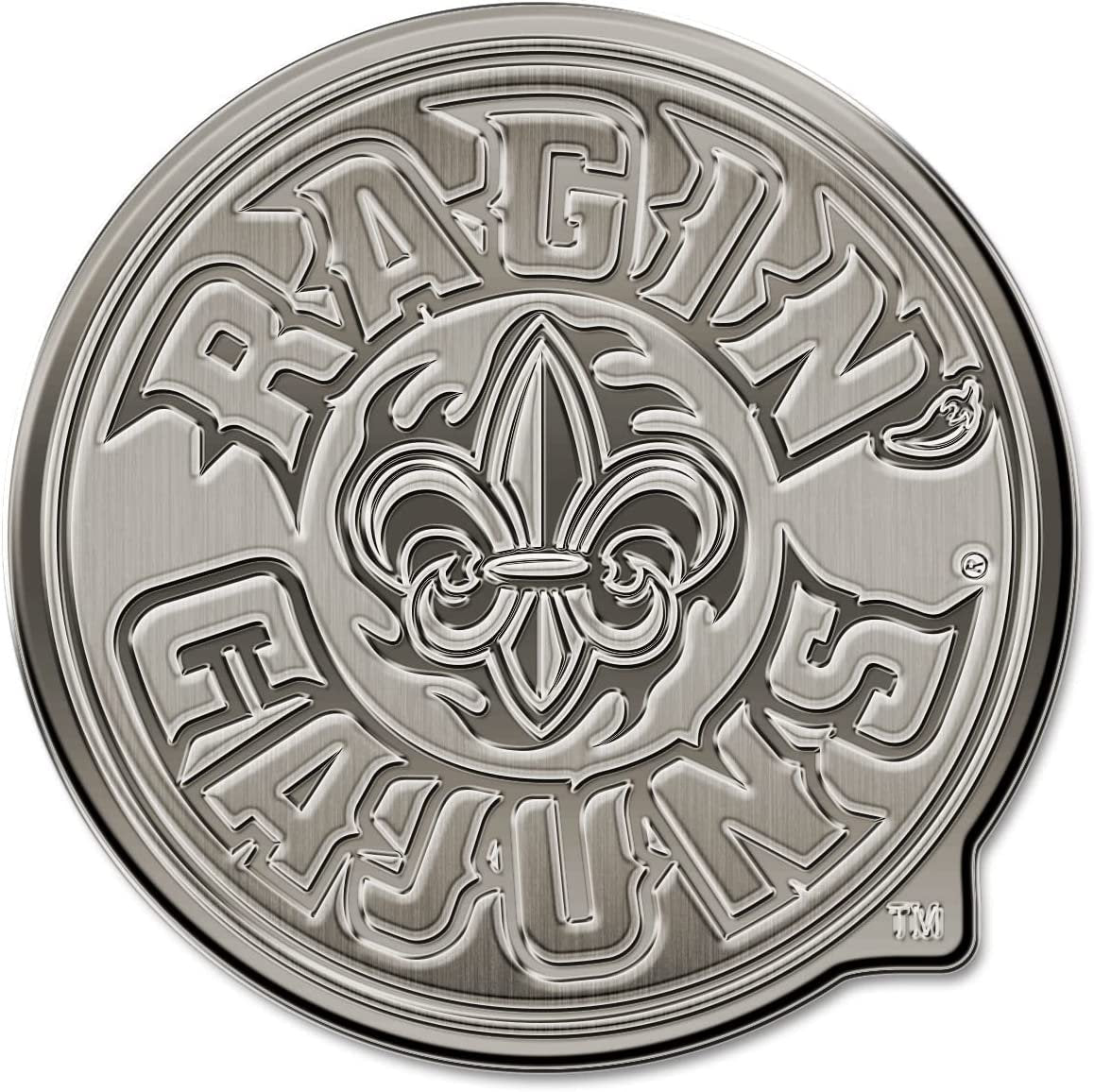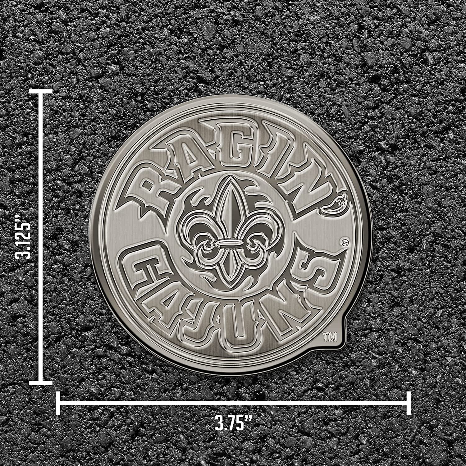 University of Louisiana Lafayette Ragin Cajuns Solid Metal Raised Auto Emblem, Antique Nickel Finish, Shape Cut, Adhesive Backing